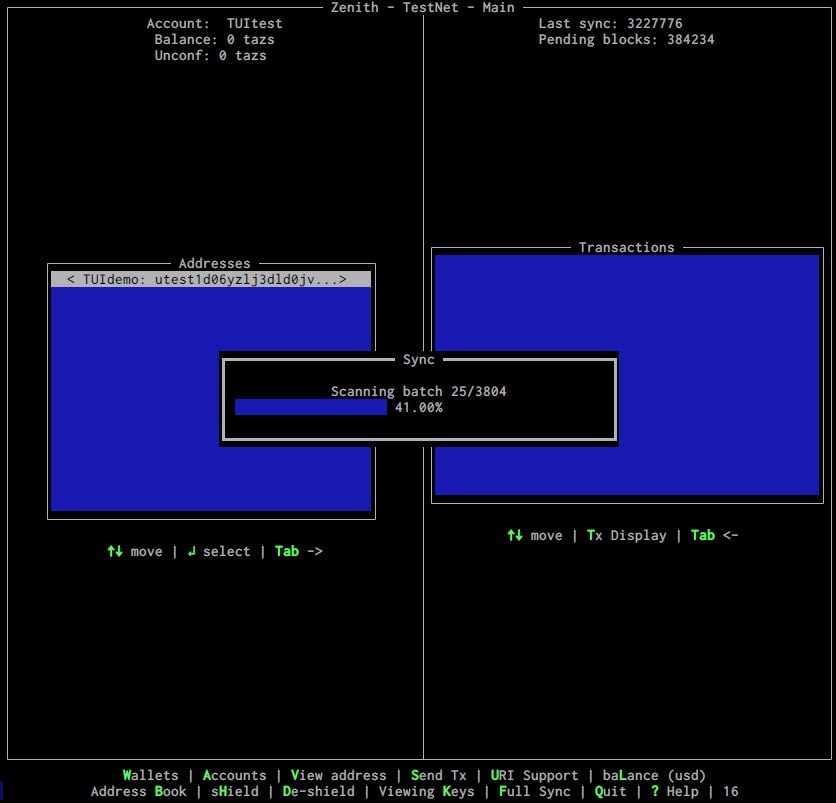 A user-requested feature to assist in catching up an older wallet. Zenith now can sync to the chain tip, while leveraging the batch sync mechanism. This feature is available both in the GUI and the TUI.
